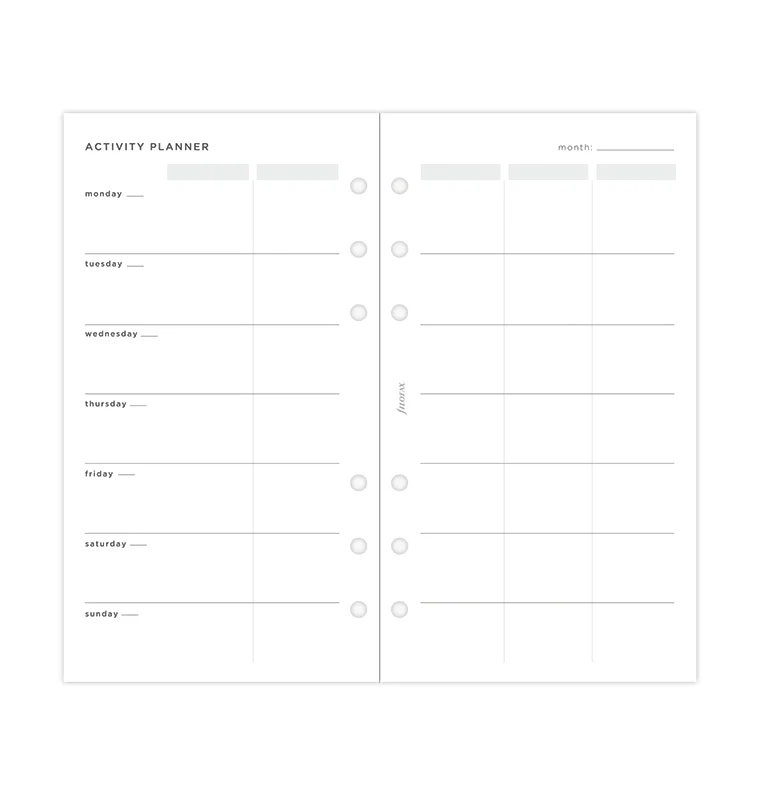 No matter how complicated your days get, this A5 activity planner refill in Minimal style has been designed to allow you to see all aspects of your life at a glance. The perfect tool for work, study or busy families. Fountain pen friendly paper - 80 gsm. Compatible with Personal size Filofax organisers and Clipbook.