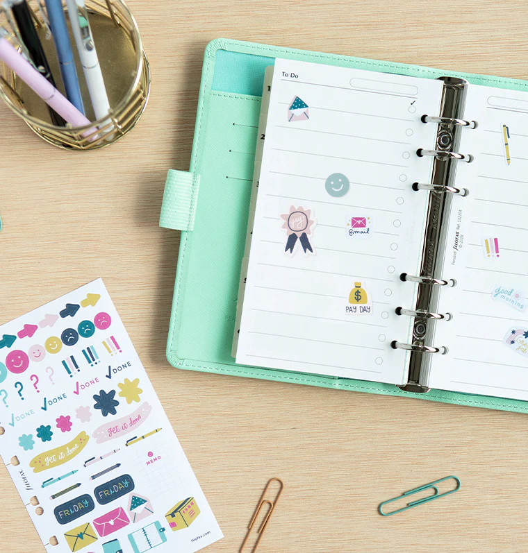 Make household chores more fun with this set of stickers from the Everyday Collection. Our stickers are repositionable and printed on a matt finish, so that you can easily write on them with pens and markers. This set has been specially designed to fit your A5/Personal Filofax Organiser and Clipbook, or your A5/A4 Refillable Notebook. Includes six sticker sheets featuring two unique designs.
