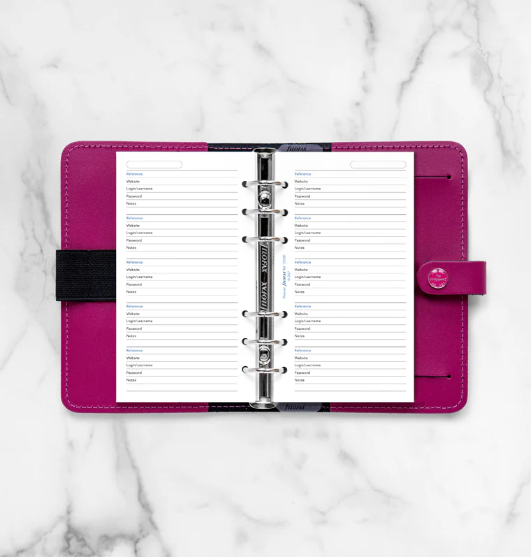 Never forget passwords again with these handy Password Paper Refills for your Filofax Personal size Organiser or Clipbook. Complete with reference, website, login, password and notes fields you can keep your login information all in one place.